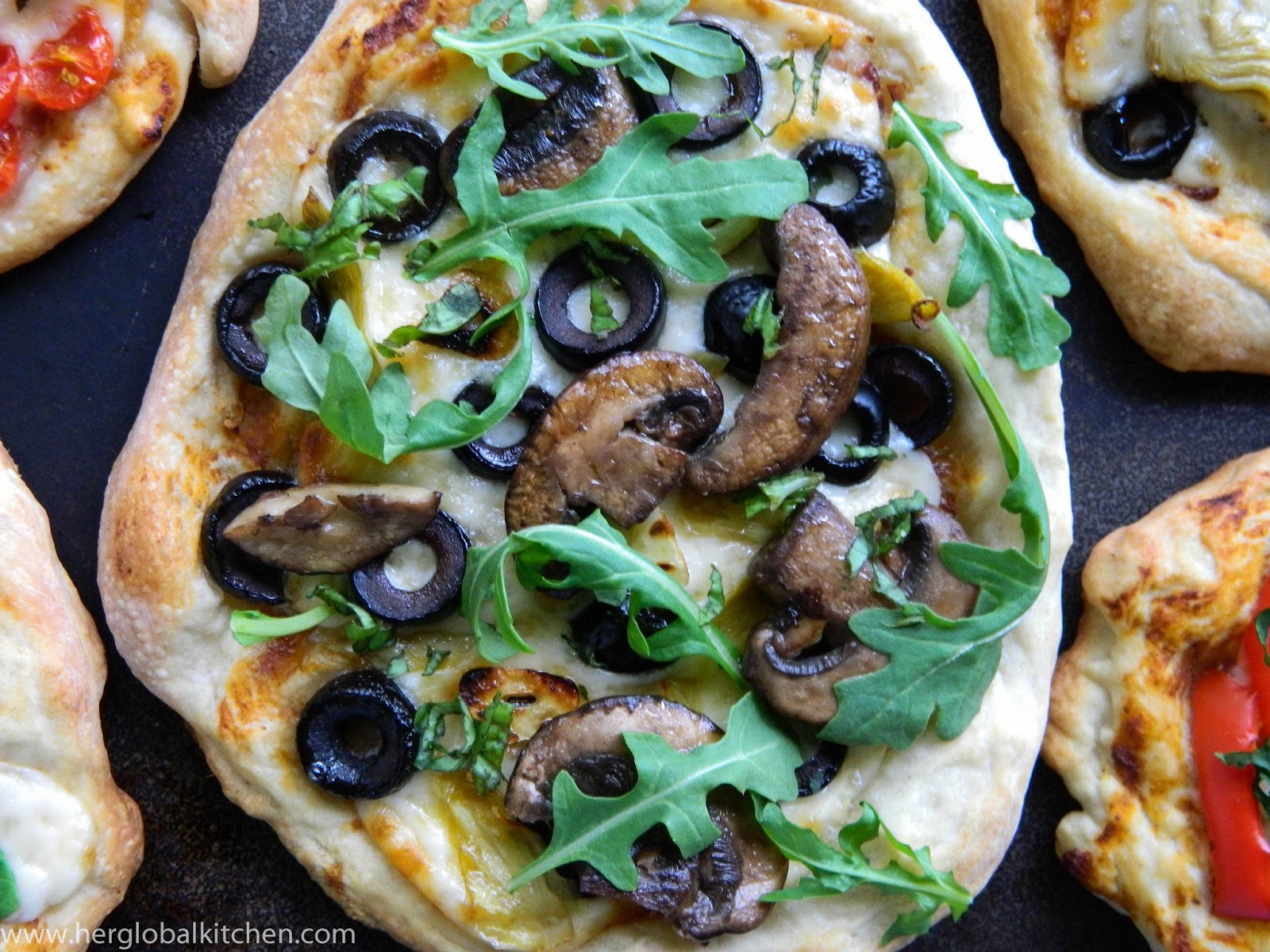 So, which one won? Hmm.. I love all of the above! While it is simpler to just mix all the vegetables in one big crust, this was fun to make and eat. The smallest pizza in the group was big enough to divide into 3 slices, so it was really fun to have small sizes of 5 different kinds of vegetable pizza. All five won, so there will soon be another mini pizza night, I'll make it exactly like this but will most probably add more mini crusts topped with grilled meats and pineapples. :)